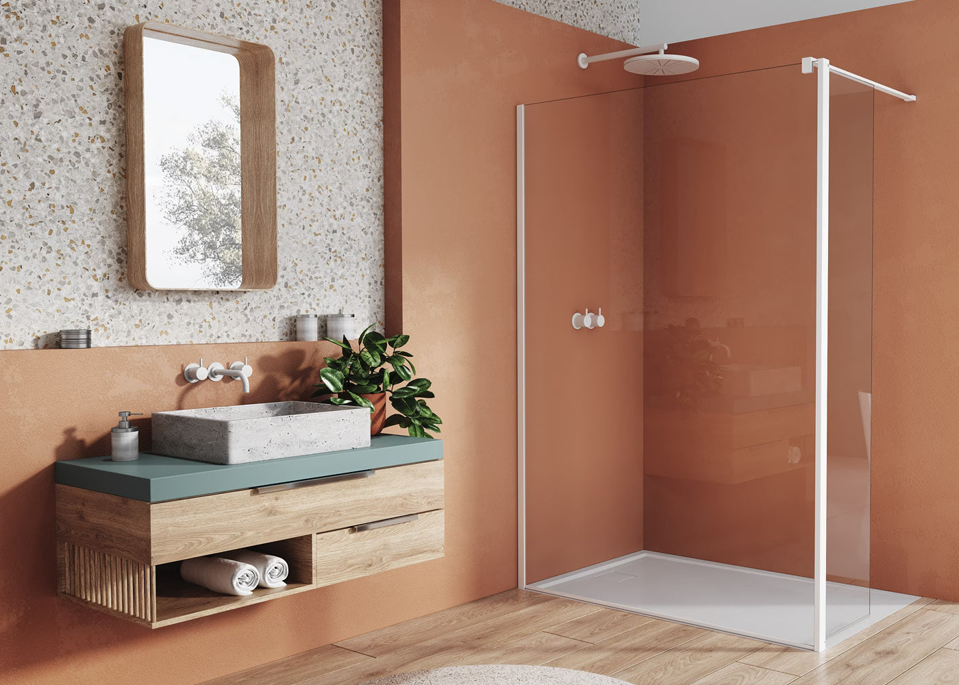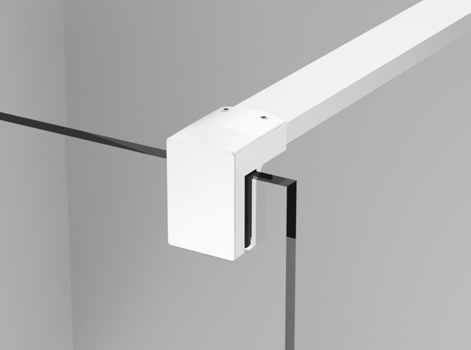 EASY STR4P – Paravan duș Ronal cu profil compensator de fixare + parte mobilă laterală la 90° 421 mm, sticlă transparentă, profil alb mat
